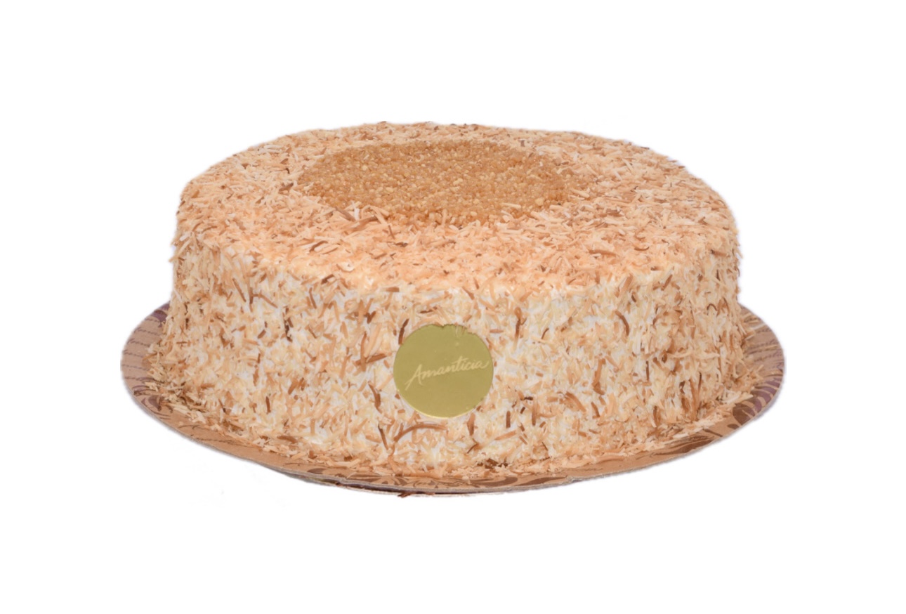 Saboroso pão de ló branco com recheio de creme de coco ao leite condensado e brigadeiro branco gourmet, coberta com chantilly, finalizado com coco queimado manualmente e crocante de caramelo.