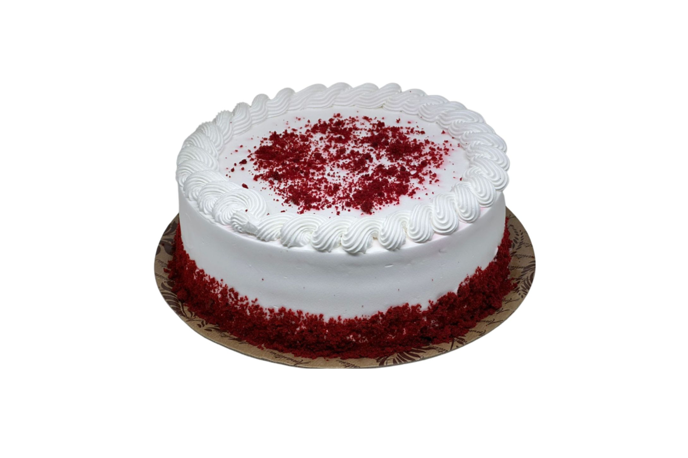 Sofisticado pão de ló vermelho com dois recheios de brigadeiro branco gourmet coberto com chantilly e finalizado com chuva de flocos red velvet.