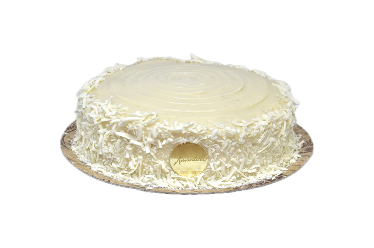 Aerado pão de ló branco com dois recheios de brigadeiro gourmet branco coberto com brigadeiro gourmet branco, finalizado com raspas de chocolate branco.